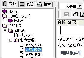 逆引は、文字列を指定して全文検索を行い、該当する文章のツリーを逆展開していきます 例えば、文書データーベースを業務改善で利用している場合に、「会議」について言及している文書をリストアップして、指定した文書を大分類に向け展開します (表示位置・サイズは指定・変更できます)