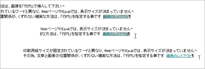 下の例では、「画像のレイアウト」のキャプションの最後の位置で文字列が反転している状態だと、リンクの中にいますので、ここで文字を入力すると、リンクのキャプションに追加されます(キャプションの編集中となります)