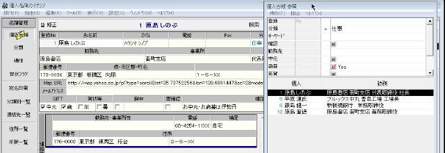 画面右上の検索ボックスで、項目を指定して、値をセットして下さい かな名・名前・勤務先で探せます