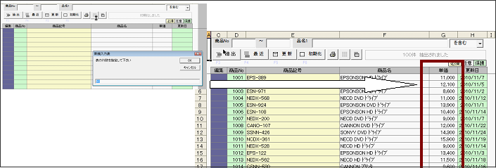 簡単な商品マスターは下記の様になっています 右下が dbFieldでフィールド定義の一覧です