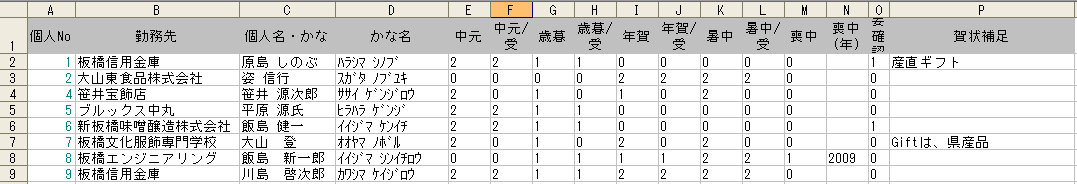 中元・歳暮・年賀・賀状のチェックマークをクリックしてオン(出す人)・オフ(出さない人)を修正します