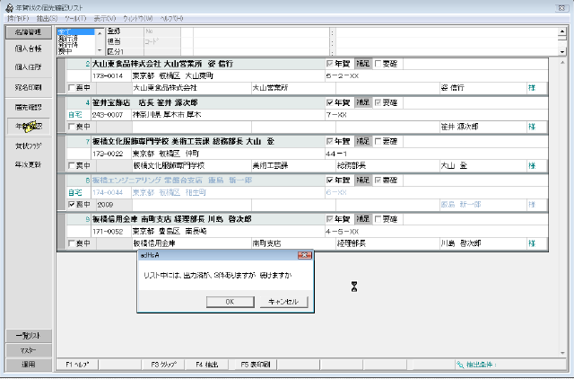 宛名印刷の指定で既に出力済みがあると確認メッセージが表示されます