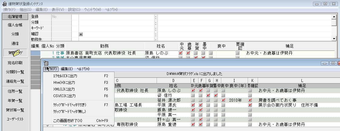 中元・歳暮・年賀・賀状のチェックマークをクリックしてオン(出す人)・オフ(出さない人)を修正します